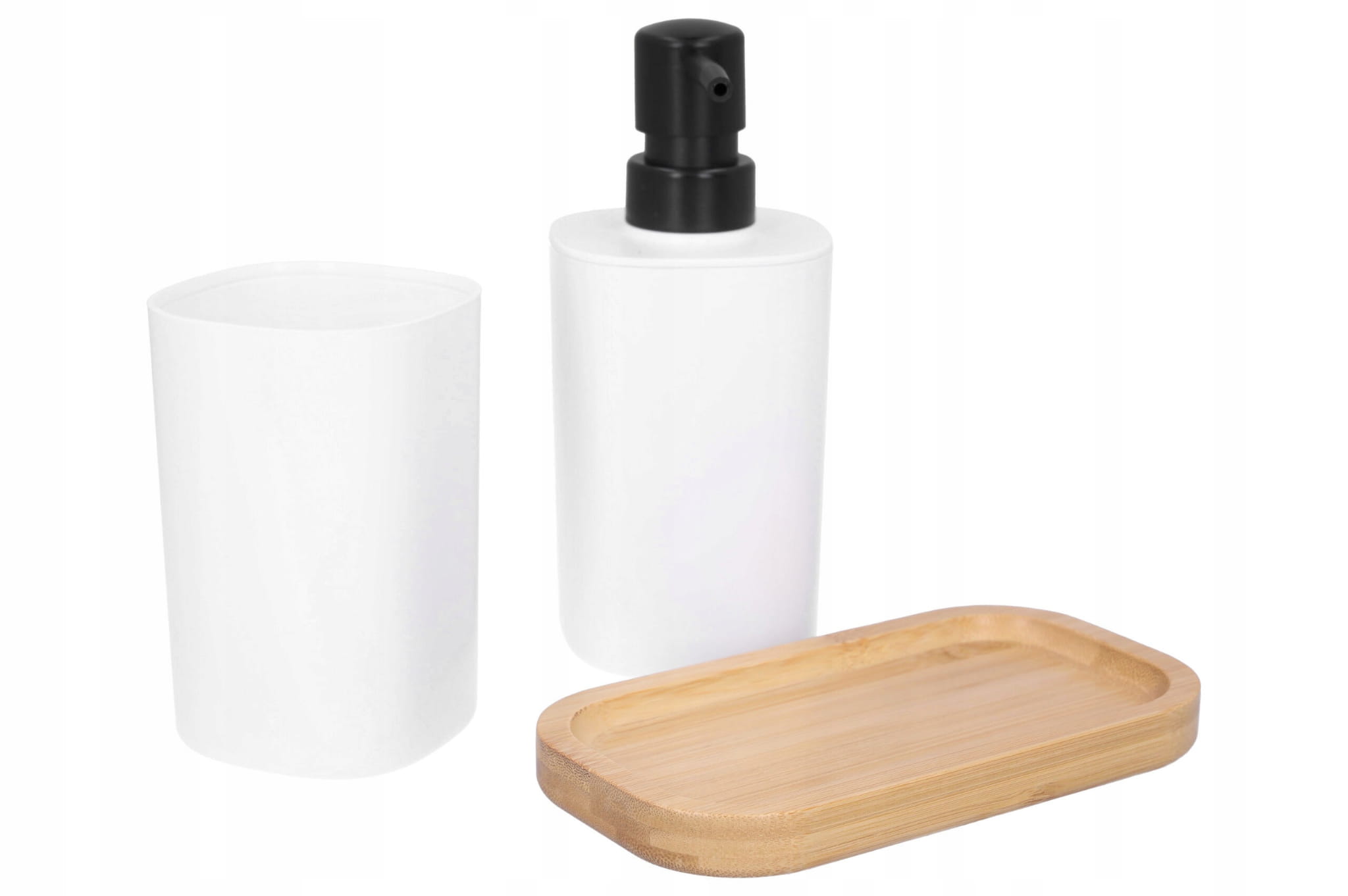 - Komplet zawiera dozownik na mydło, kubek łazienkowy oraz podstawkę bambusową