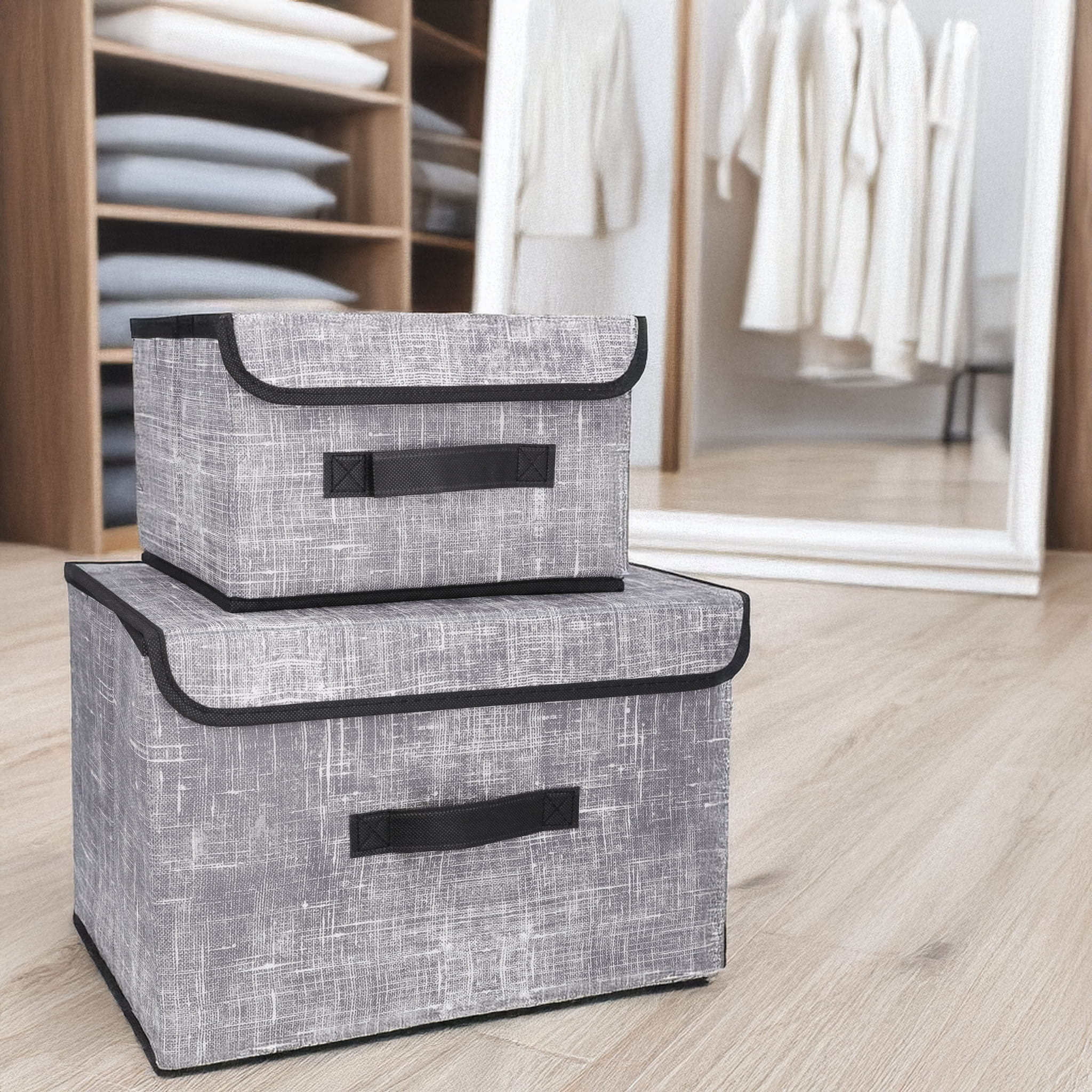 Praktyczny zestaw 2 składanych organizerów tekstylnych idealny do przechowywania ubrań, bielizny, zabawek, dokumentów i akcesoriów. Trwałe, estetyczne i uniwersalne – pasują do każdej szafy, komody czy garderoby.