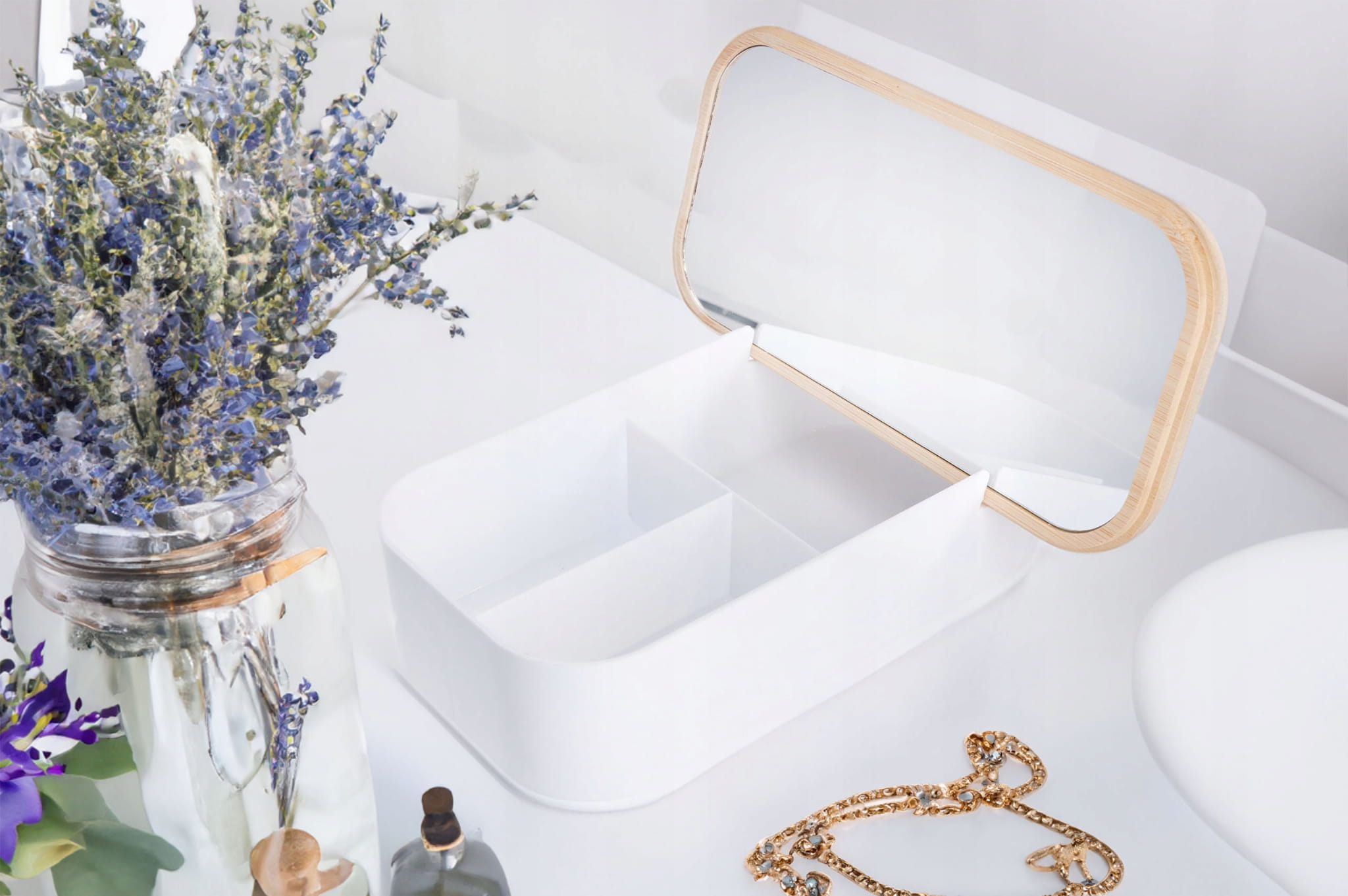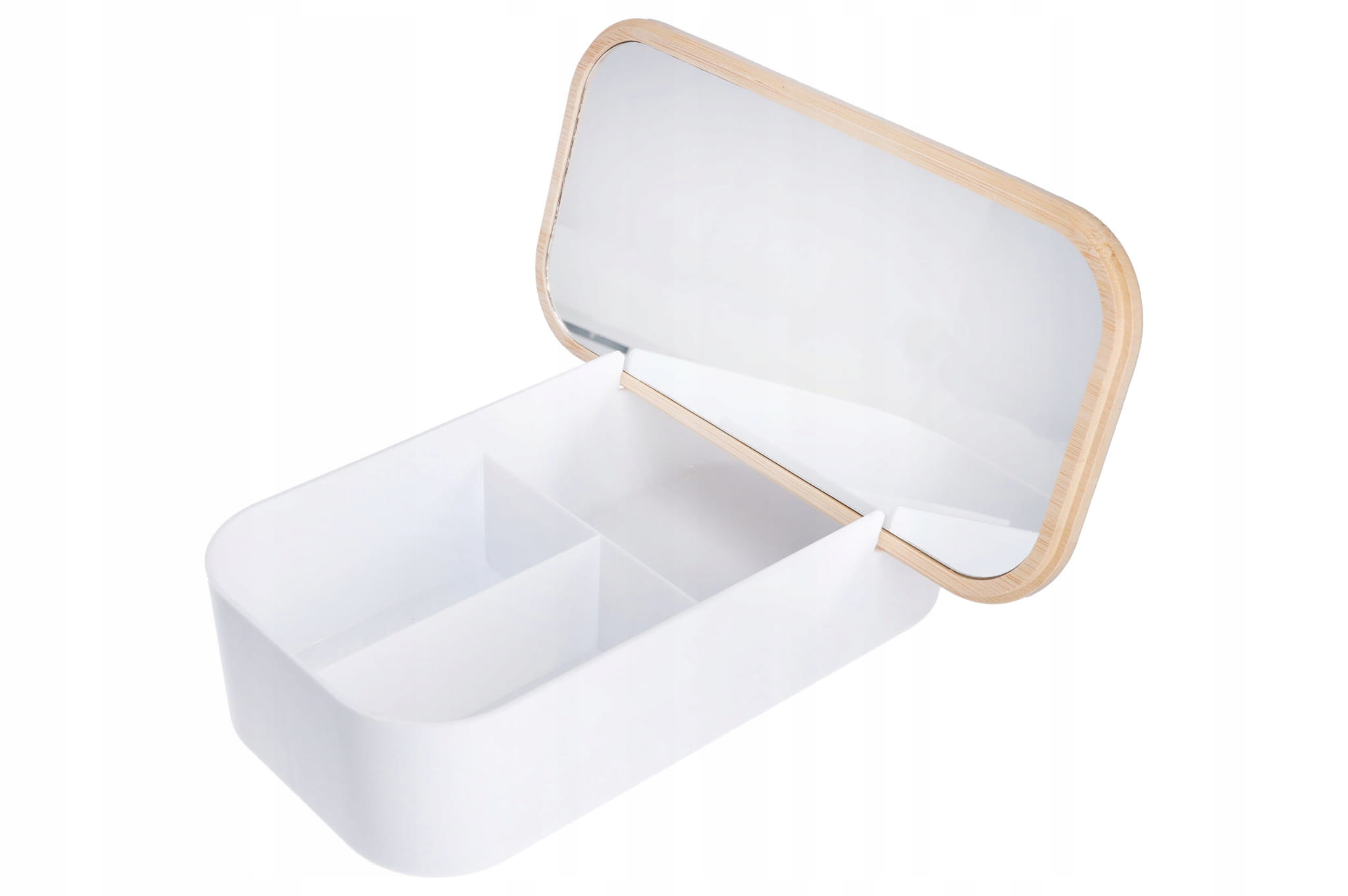 Wykonany z wysokiej jakości białego tworzywa, pojemnik jest trwały i odporny na uszkodzenia. Pokrywka z drewna bambusowego dodaje mu elegancji i stylu. Lusterko o wymiarach 23 x 11 cm jest idealne do wykonywania precyzyjnego makijażu i prostych zabiegów kosmetycznych.